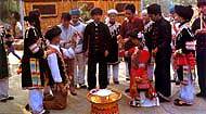 结婚 澜沧地区的拉祜族多在男家举行婚礼;耿马、双江一带的拉祜族多在女家举行婚礼。届时,要请亲友及寨邻喝酒吃饭,并到男女双方家中祭祀祖先、神灵,参拜双方父母亲威。